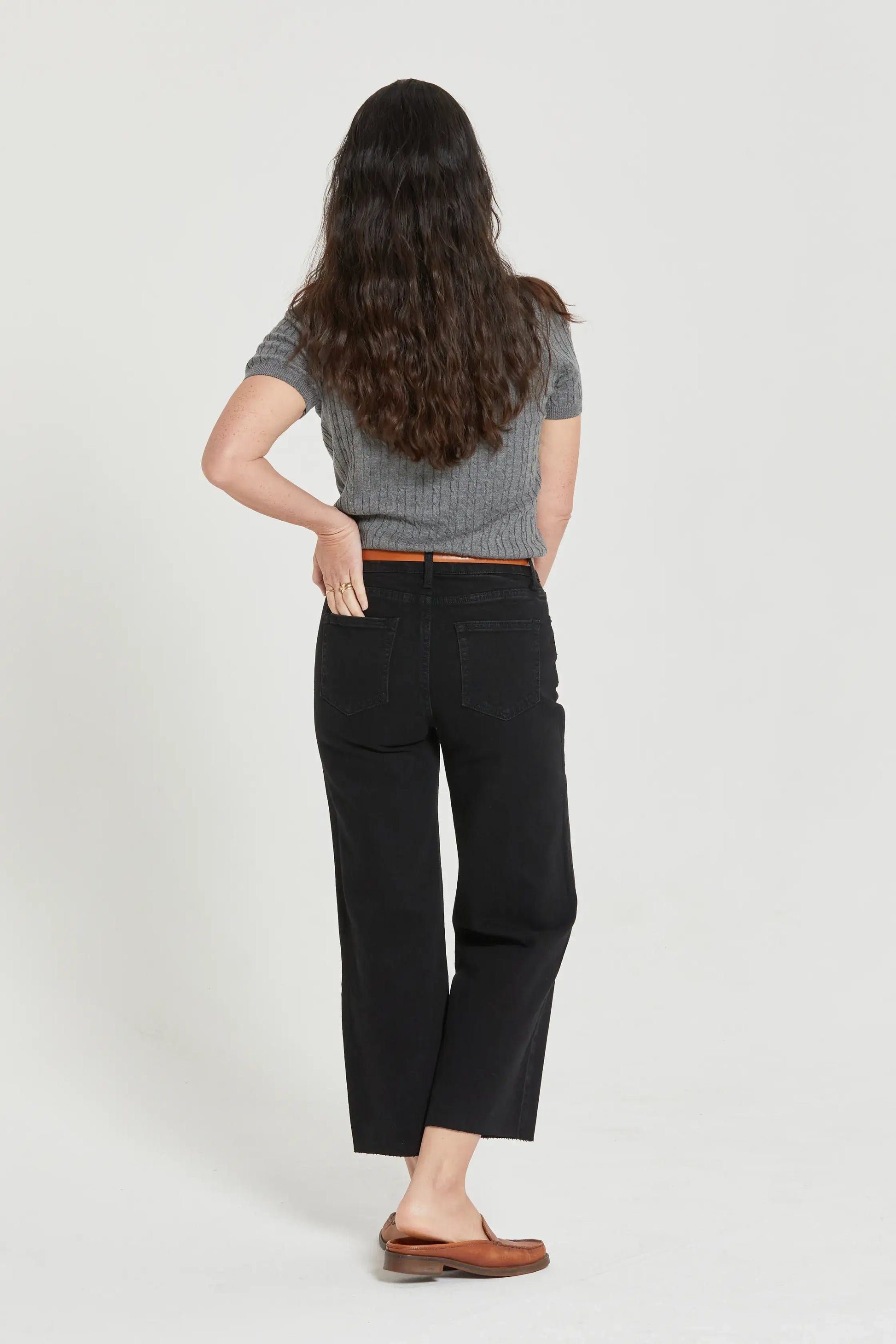 THE FIT: High rise, fitted through the hip, zipper fly, wide leg, and a cropped raw hem.